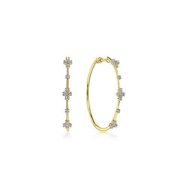 Single round diamonds and sparkling quad clusters are dispersed along the front of each delicate earring. Amidst the diamonds, glossy 14k yellow gold hoops cut a slim but chic silhouette. Channel a modern luxe vibe with these 0.13ct diamond hoop earrings.