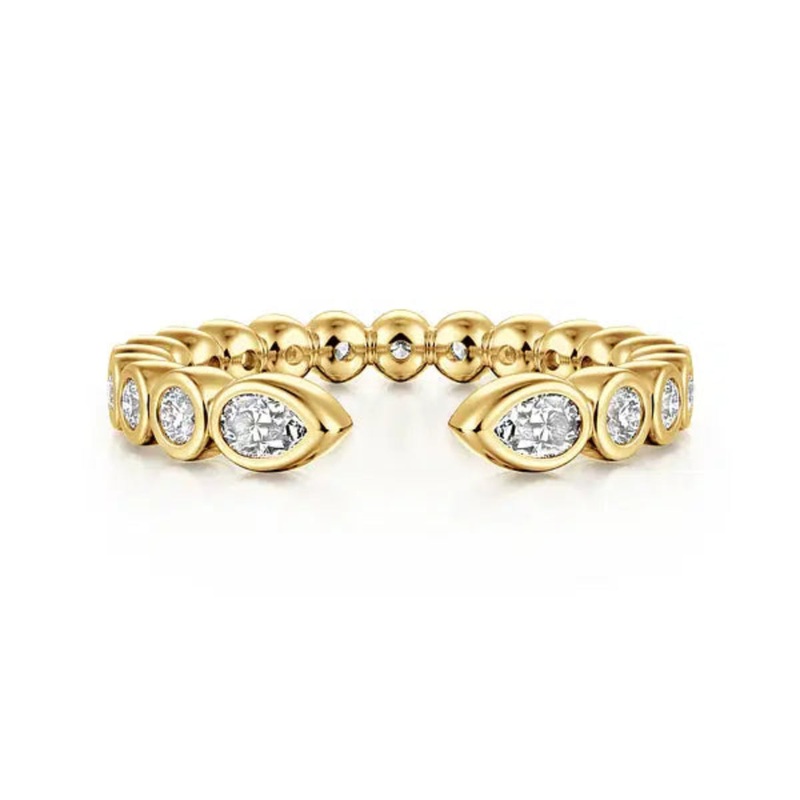 This 14K Yellow Gold Bezel Set Band sparkles with clusters of pear and round diamonds, set in a unique and eye-catching open design. Sophisticated yet playful, this eternity band is the perfect addition to any collection. Keep the shine on forever with this one-of-a-kind ring.