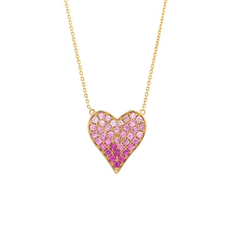 This exquisite 14K yellow gold pendant features a heart-shaped design adorned with a stunning 0.76 carat total weight of multi-color pink sapphires. It exudes luxury and sophistication, making it the perfect accessory for any formal event or special occasi