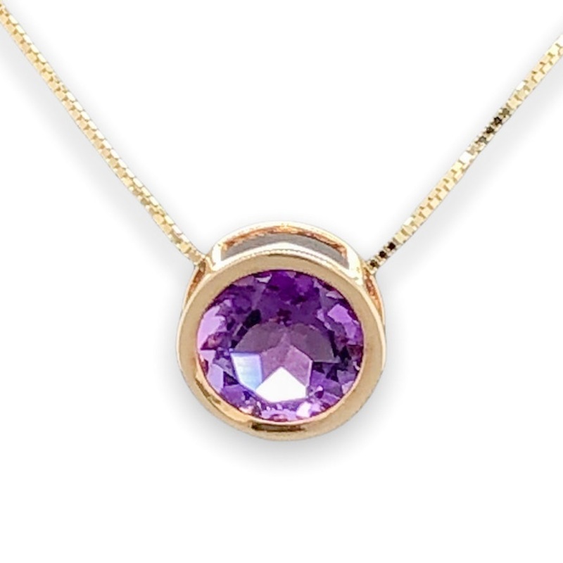 This pendant has been made in 14k yellow gold and holds a 7.4mm round amethyst bezel set in its slide. This slide pendant measures 8.66mm in diameter, slides freely on its 18 box chain, has a spring ring clasp, and weighs 0.85dwt.Chain Type:BoxClosure:Spri