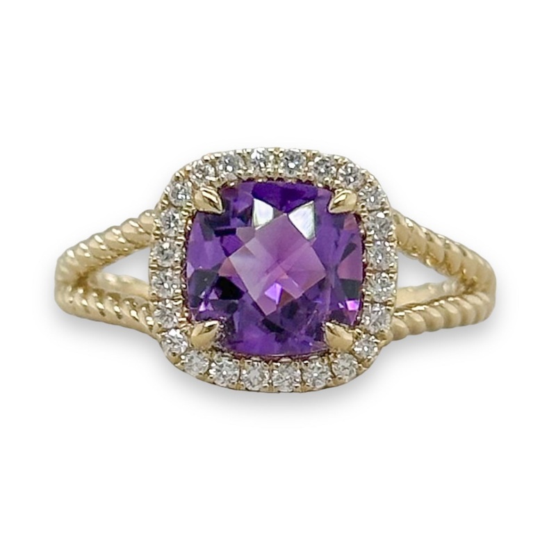Color:Yellow Gold.Main Stone:AmethystMain Stone Color:PurpleMain Stone Shape:SquareMain Stone Creation:NaturalMain Stone Treatment:HeatedSecond Stone:Diamond