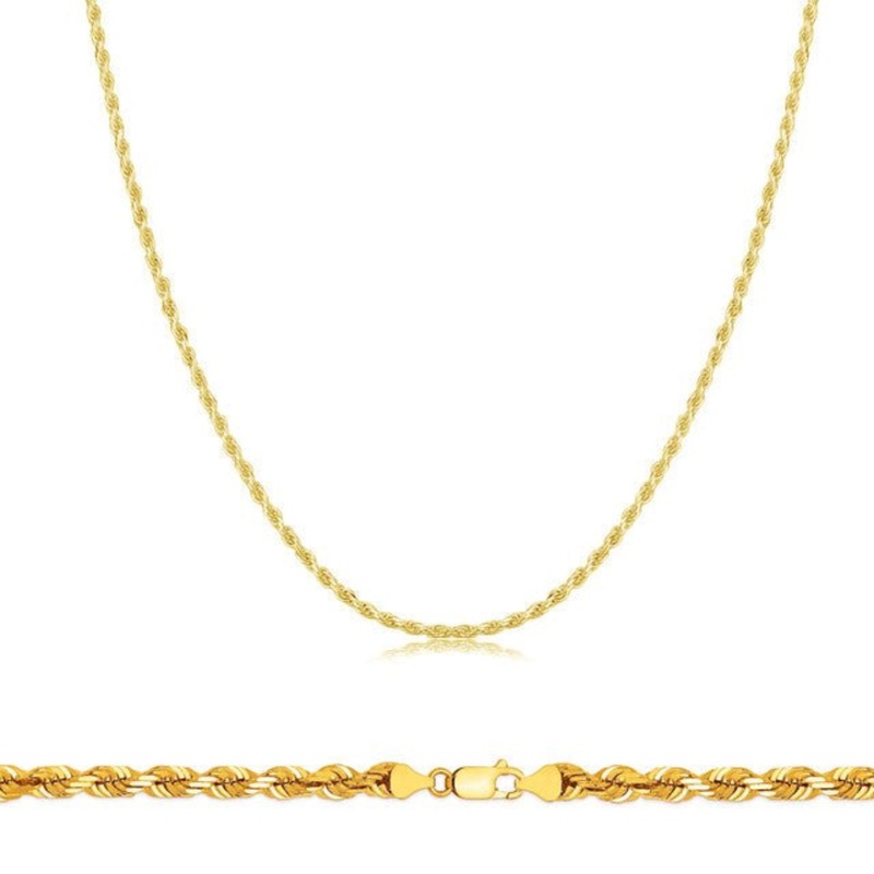 14k Yellow Gold 16″ Diamond Cut Solid Rope Chain with lobster clasp 1.6mm It’s the perfect way to add a touch of luxury to your everyday look. This piece of jewelry will make any outfit the perfect combination of classic and modern style. It’s a timeless addition to any jewelry collection.