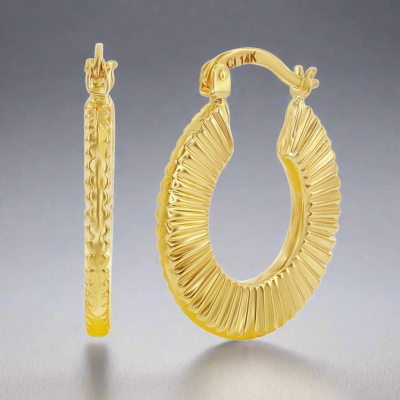 Make a statement with these exquisite 14K Yellow Gold 20mm Textured Hoop Earrings. The striking diamond shape design will catch the eye and leave a lasting impression. Embrace the luxurious shine of high-quality gold and radiate elegance and exclusivity.