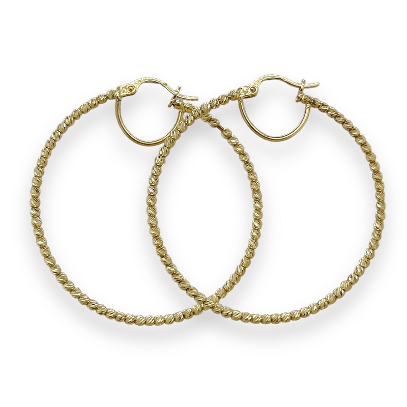 These 14K Yellow Gold 47mm Diamond Cut Beaded Hoop Earrings boast a luxurious, sophisticated design. Crafted with a meticulously-cut beaded design, the earrings offer a timeless aesthetic, perfect for any occasion. Each piece is constructed with care from premium 14K Y gold and makes a stunning statement of luxury.