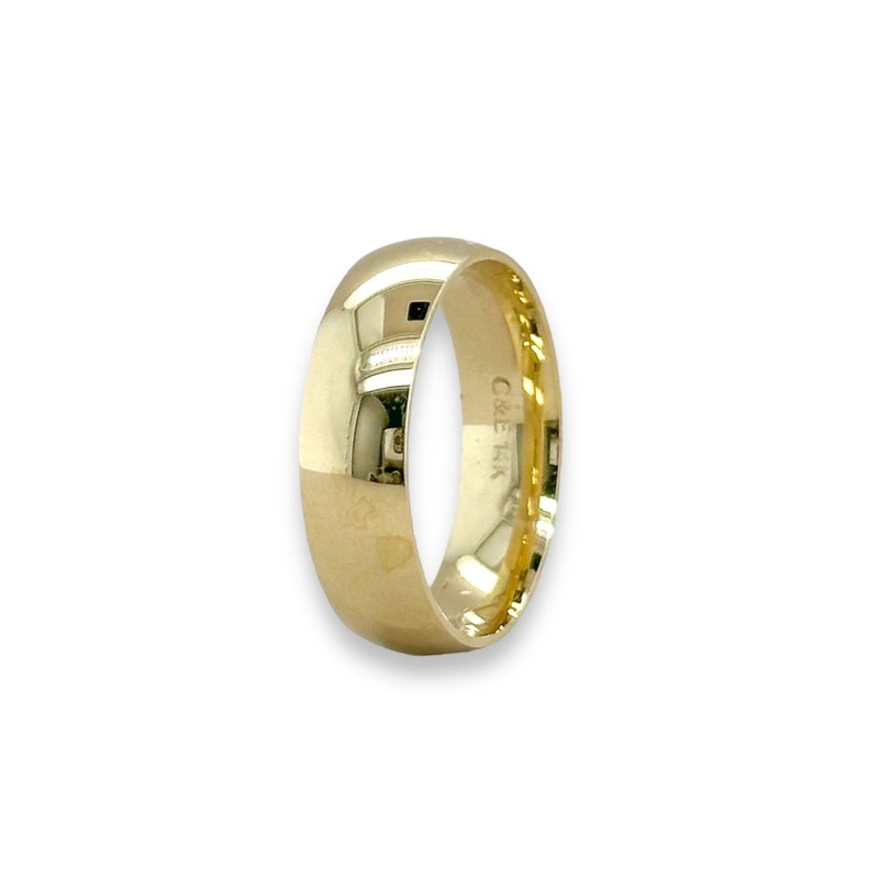 This classic 14K yellow gold band is a beautiful addition to any wardrobe. It is 6mm wide, designed with a heavy curved silhouette and perfect for all occasions. Add a timeless touch to any occasion with this stunning gold band.