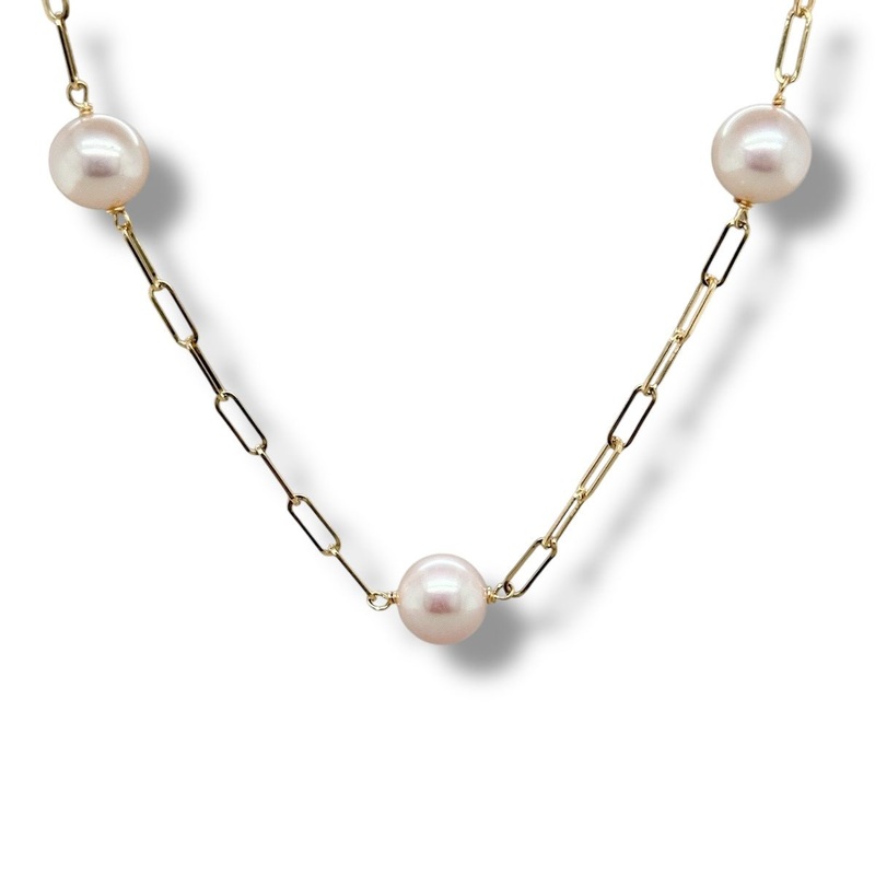 Indulge in luxury with our 14K yellow gold Fresh Water Pearl paperclip tin-cup necklace. The delicate 8-9mm freshwater pearls are intricately linked together by a stunning paperclip chain, creating a unique and sophisticated piece. Elevate any outfit with this exclusive accessory.