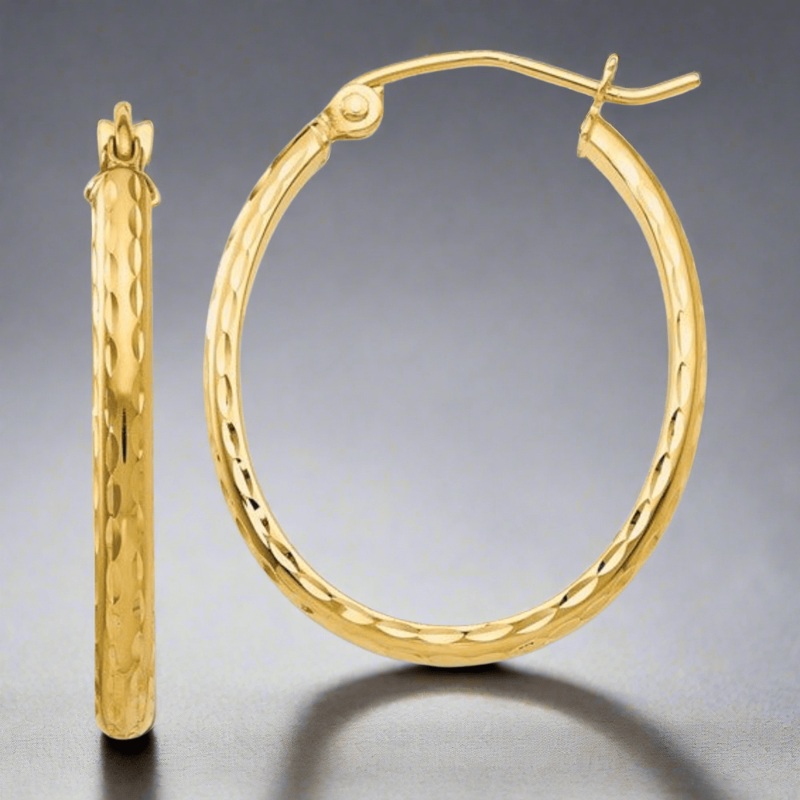 14k Yellow gold oval diamond cut hoop earrings Experience timeless elegance with our 14K Y Gold 26mm Oval DC Hoop Earrings. The diamond cut design adds a touch of sparkle to your ensemble, making you stand out in the most luxurious way. Perfect for any occasion, these earrings are a must-have for any jewelry collection. Elevate your style with these exquisite earrings and embrace a life of luxury.