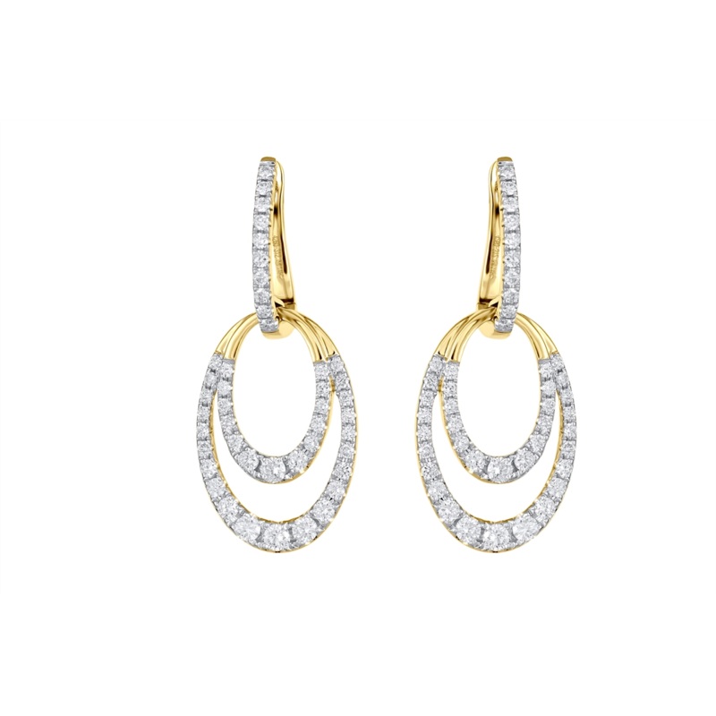 Ladies diamond earrings in 14 karat yellow and white gold. Set in the dangle earrings are 88 round brilliant cut diamonds with a total weight of 1.07 carat.