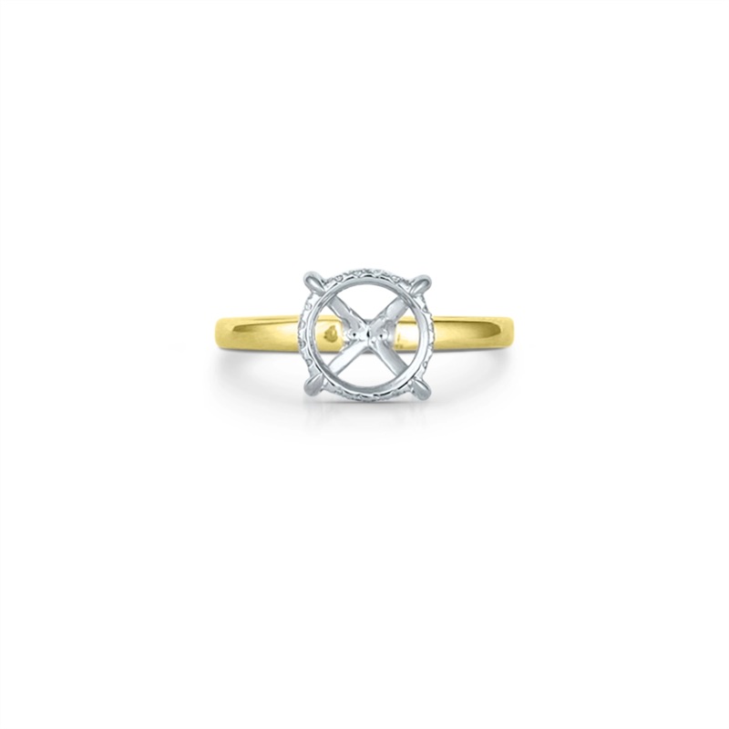 Ladies diamond ring in 14 karat yellow and white gold. Set in the hidden halo in the ring are 16 round brilliant cut diamonds with a total weight of 0.10 carat. The halo diamonds average SI2 in clarity and GH in color.