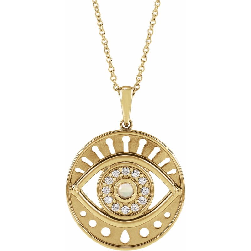 87271 / Set / White Ethiopian Opal / Round / Necklace / 14K Yellow / I1, G-H :: 1/6 Ctw / 27.5 X 20 Mm / 16-18 In / Polished / Ethiopian Opal And 1/6 Ctw Diamond Evil Eye Necklace