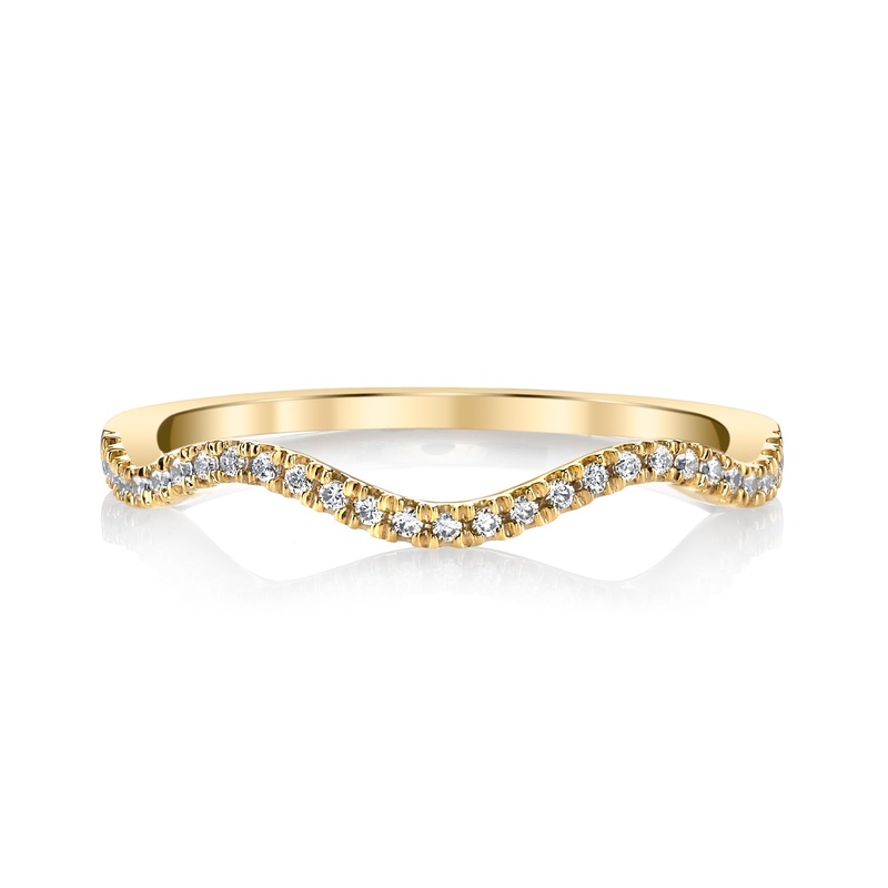 A contemporary fashion ring with curving diamond accents. Shown in Yellow Gold. Price includes all stones pictured.