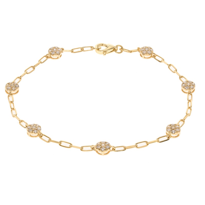 This exquisite gold bracelet features a delicate chain adorned with sparkling diamonds. Each cluster of diamonds are set in a beautifully crafted gold link, creating a timeless piece that adds a touch of elegance to any outfit. Perfect for both everyday wear and special occasions, this bracelet is a must-have for any jewelry collection.