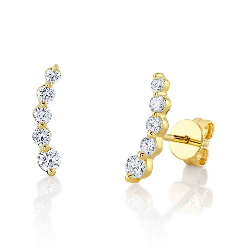 Ladies diamond earrings in 14 karat yellow gold. Set in the climber stud earrings are 10 round brilliant cut diamonds with a total weight of 0.47 carat.