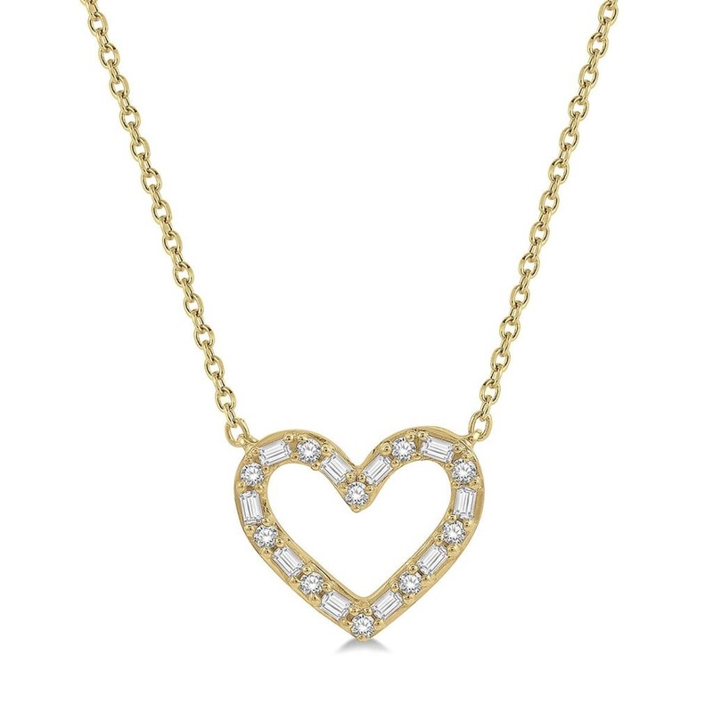 Style: Heart Metal: 14K Yellow Gold Stones: (20) Round Brilliant Cut Diamonds Total Carat Weight: 0.25 Setting: Shared Prong Length: 18 Inches Center Dimension: 11.00mm X 13.00mm (Approximately 2/5 In X 1/2 In) Vendor Style No.: 992GQFHNKYG