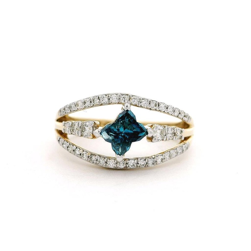 Style: Flower Metal: 14K Yellow Gold Stones: (1) Irradiated Blue Clover Diamond (40) Round Diamonds Total Carat Weight: 1.02Ctw Setting: Prong Finger Size: 7 Vendor Style No.: AD13605Y4