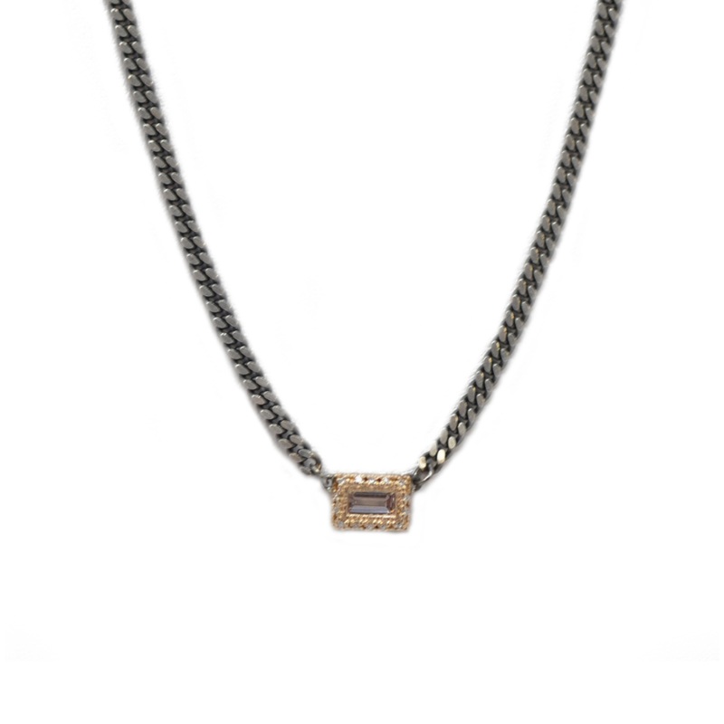 14k Rose Gold and Grey Sterling SilverNecklace with 0.07 CT White Diamonds and 6x3m Baguette Peach Morganite.Adjustable 15.5"- 16.5".