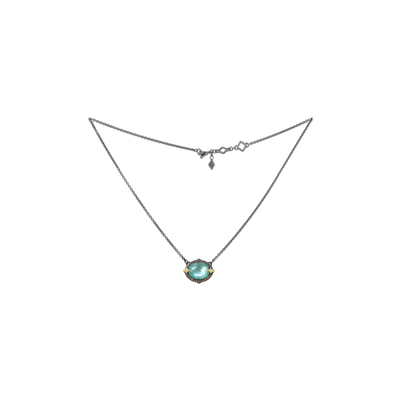 Necklace 18kT Yellow Gold and Blackened Sterling Silver With 0.115 CT Champagne Diamonds and 14×11 Emerald. Adjustable at 15.5″, 16″ and 16.5″