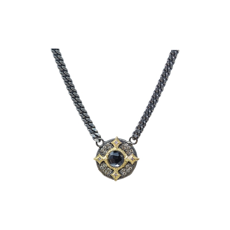 Necklace 18k Yellow Gold and Grey Sterling Silver whit crivelli 0.119 CT White Diamonds and 3mm Round Hematite .Adjustable at 15.5″, 16″ and 16.5″.