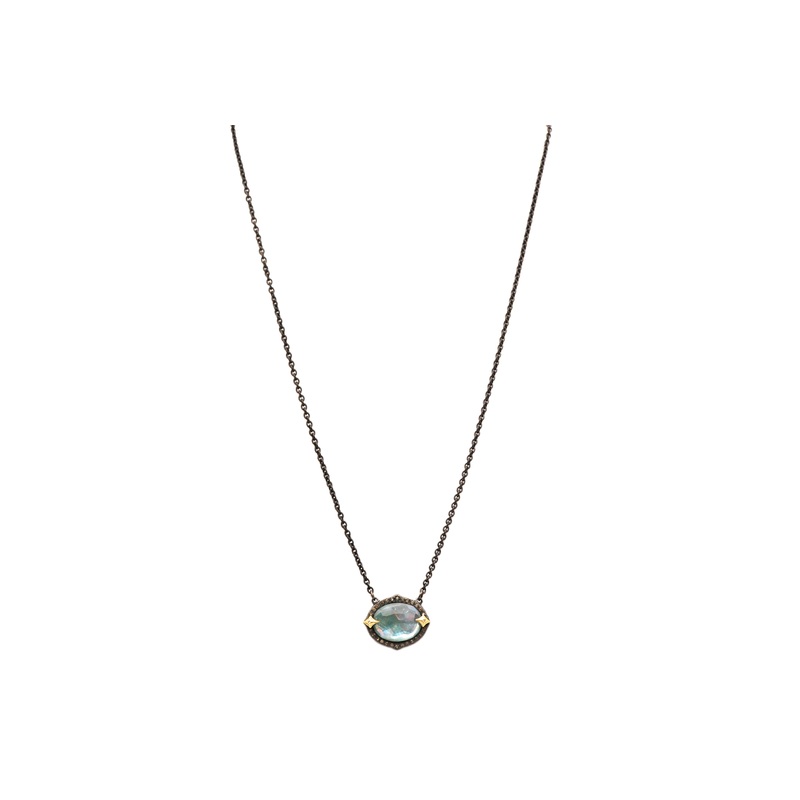 18k Yellow Gold and Blackened rhodium finish Sterling Silver pointed Peruvian Opal/ White MOP/White Quartz triplet oval east/ west 16.5″ necklace featuring .10TCW round brilliant champagne diamonds. Toggle closure; Adjustable at 15.5″, 16″ and 16.5″.