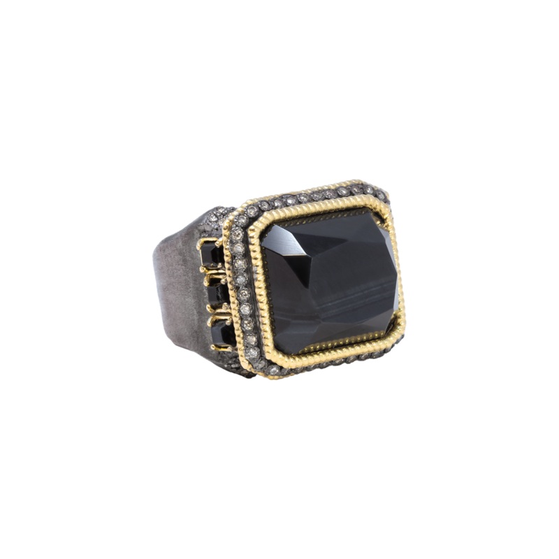 Ring 18k Yellow Gold and Grey Sterling Silver 16x14mm Tiger eye with 0.368 CT Champagne Diamonds