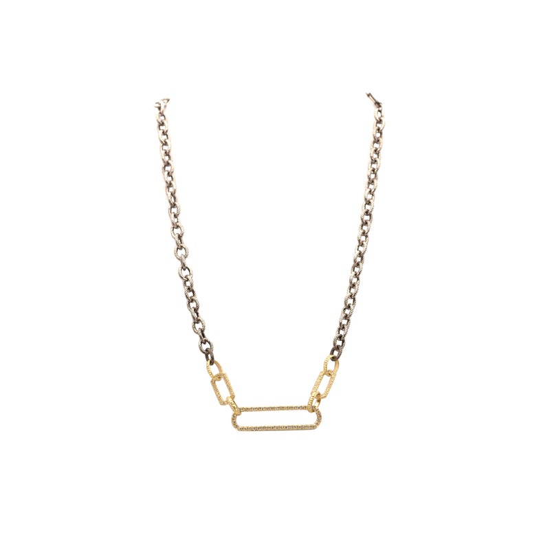 18k Yellow Gold and Grey rhodium finish Sterling Silver 17″ pave paperclip link necklace with .80TCW roundchampagne diamonds. With toggle closure. Adjustable at 15″, 16″ and 17″. Necklace measures 10mm wide.