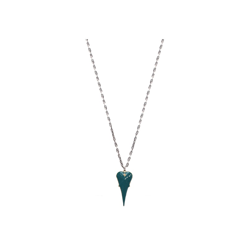 14k Rose Gold and Blackened rhodium finish Sterling Silver 18″ necklace with 45mm teal enamel heart with crivelli and 0.01TCW round champagne diamond. Adjustable at 16″, 17″ and 18″. Pendant measures 47mmx21mm.