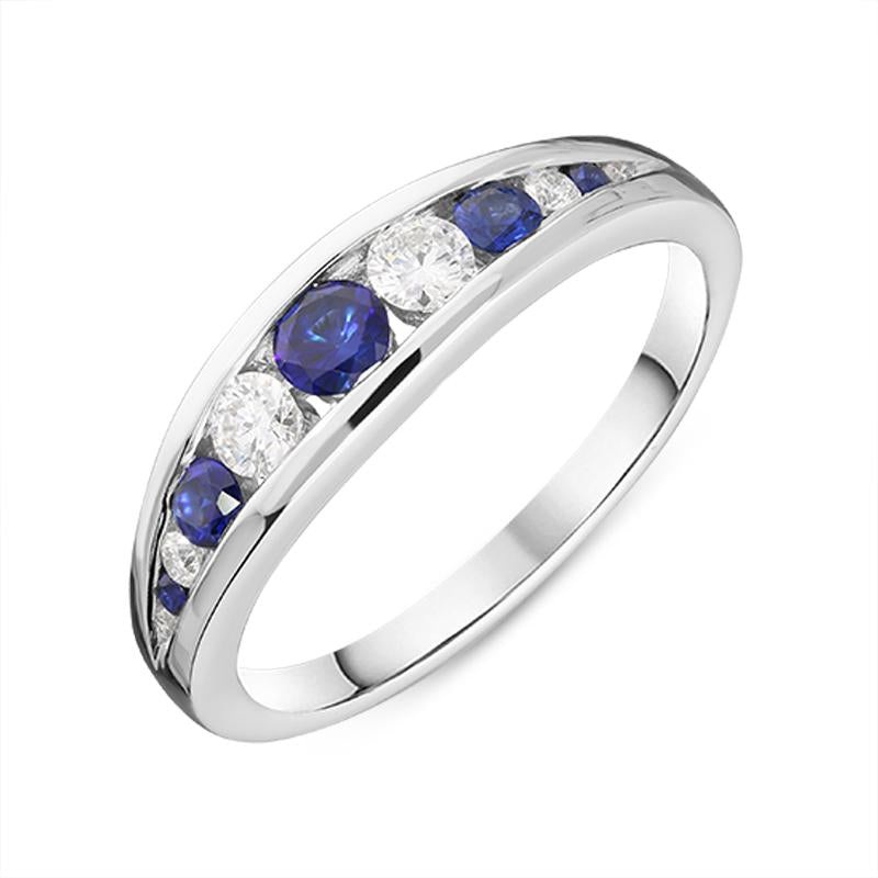 This feminine 18ct white gold half eternity ring features alternating sapphires, totalling 0.33cts, and sparkling brilliant cut diamonds, totalling 0.24cts, which graduate in size and are channel set within the band. Designed perfectly for everyday wear, this gemstone set piece would make the perfect half eternity or wedding ring to sit comfortably alongside other bands.