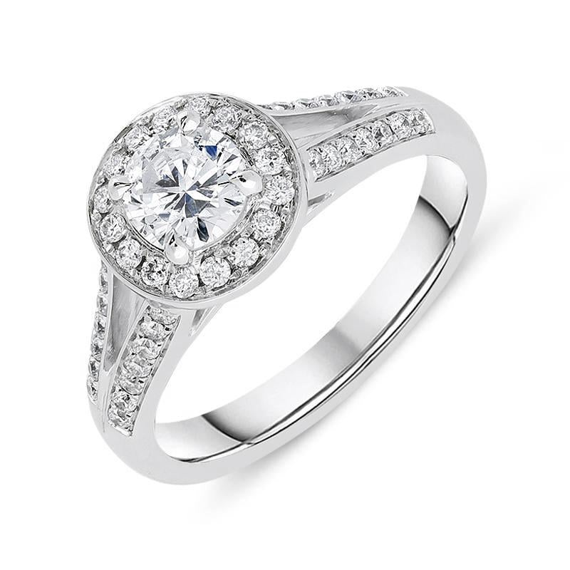 The central brilliant cut diamond is encircled by grain set diamonds which then cascade onto the split shoulders of this exquisite piece, emulating the extravagant sparkle for which this decade was famous, and adorn an 18ct white gold band. The diamonds total 0.80 carats,creatinga truly show-stopping display of dazzling light and colour.