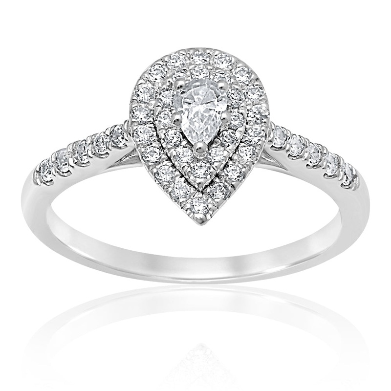 This 18ct white gold 1/2 carat pear diamond halo ring is set with a glittering array of dazzling diamonds for an outstanding look that is sure to turn heads. A beautiful pear cut diamond centrepiece is encased in layers of diamond halo, all with gorgeous shine. The 18ct white gold band has luxury quality, and is set with more diamond studs for the full glittery effect. This romantic piece would make anyone happy.