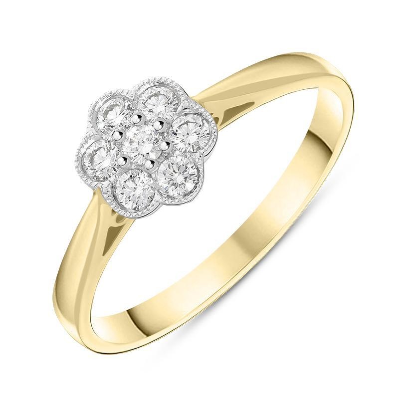 This classically styled 18ct yellow gold ring features an array of sparkling brilliant cut diamonds, totalling 0.23cts, which create this stunning floral cluster design. The central precious gemstone is claw set with the further six diamonds bezel set within 18ct white gold, allowing the maximum amount of light to travel through the stones. Designed perfectly for everyday wear, this diamond set piece would make the perfect engagement or dress ring to sit comfortably alongside other bands.