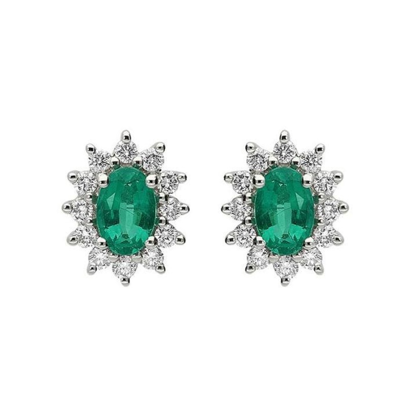 These elegant 18ct yellow gold stud earrings feature two stunning oval cut emeralds, totalling 0.76cts, which are claw set in 18ct white gold to allow the maximum amount of light to flow through the stones. The sparkling emeralds are then framed by 0.38cts of round brilliant cut diamonds which create the elegant and feminine floral cluster style. Completed with 18ct yellow gold post and butterfly fittings to create a stunning contrast to the white gold settings.