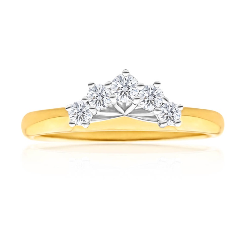 This gorgeous 18ct Yellow Gold & White Gold ‘Anise’ Ring With 0.25 Carats Of Diamonds will brighten your day. Set in a unique arch, these five brilliant cut diamonds will sparkle endlessly under light. The 18ct white and yellow gold theyre set in has a pristine quality that can be observed in its colour and gleam. A stunning ring for you to cherish deeply.