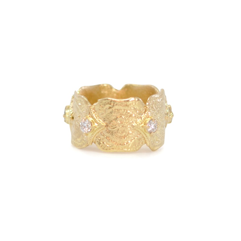 Sueno 18kt yellow gold artifact stack ring with crivellis and white diamonds.