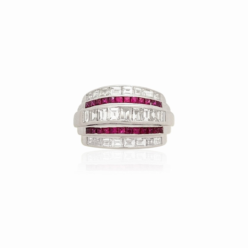 This platinum ruby and diamond ring is a vintage piece from the 1950s. It features 25 baguette diamonds, totaling approximately 2.50 carats, and 24 French-cut rubies with an approximate total weight of 1.00 carat. The ring is made entirely of platinum and