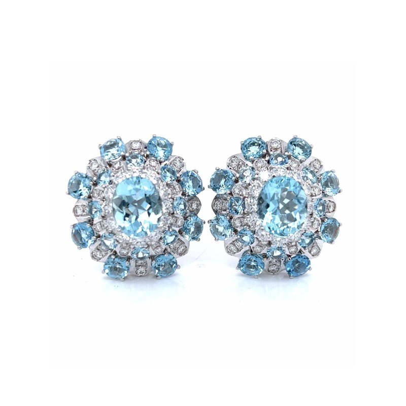 These vintage earrings from the 1960s feature a sophisticated design crafted in 18kt white gold. They are adorned with 34 aquamarines totaling approximately 30.00 carats, complemented by 88 diamonds weighing around 3.50 carats, with F-G color and VVS-VS clarity. The combination of gemstones offers a refined aesthetic suitable for those seeking timeless elegance in their jewelry collection.