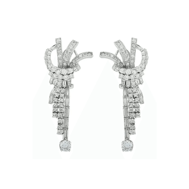 These mid-century earrings are crafted in platinum and feature a total of 54 mixed-cut diamonds, amounting to approximately 4.00 carats. The earrings showcase a combination of baguette-cut and round brilliant-cut diamonds with VS-SI clarity and G-H-I color grade, arranged around two central round brilliant-cut diamonds. Measuring 0.96 inches by 0.74 inches, they offer secure placement with posts and friction backs. Weighing 11.70 grams, these vintage earrings from the 1960s present a sophisticated design that highlights their sparkling elegance.