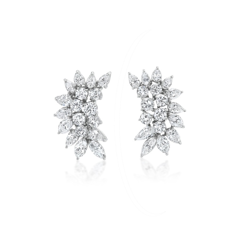 These clip-on cluster earrings, dating back to circa 1965, feature ten round diamonds totaling approximately 3.30 carats and twenty-four fancy diamonds amounting to about 12.70 carats. Crafted in platinum, these earrings offer a timeless elegance that transcends trends and generations.