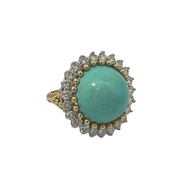 This vintage ring from the 1970s, sized at 6.25 (US), features a central turquoise surrounded by approximately 3.50 carats of diamonds set in 18kt yellow gold. Its design reflects the unique style of its era, making it a standout addition to any jewelry collection.