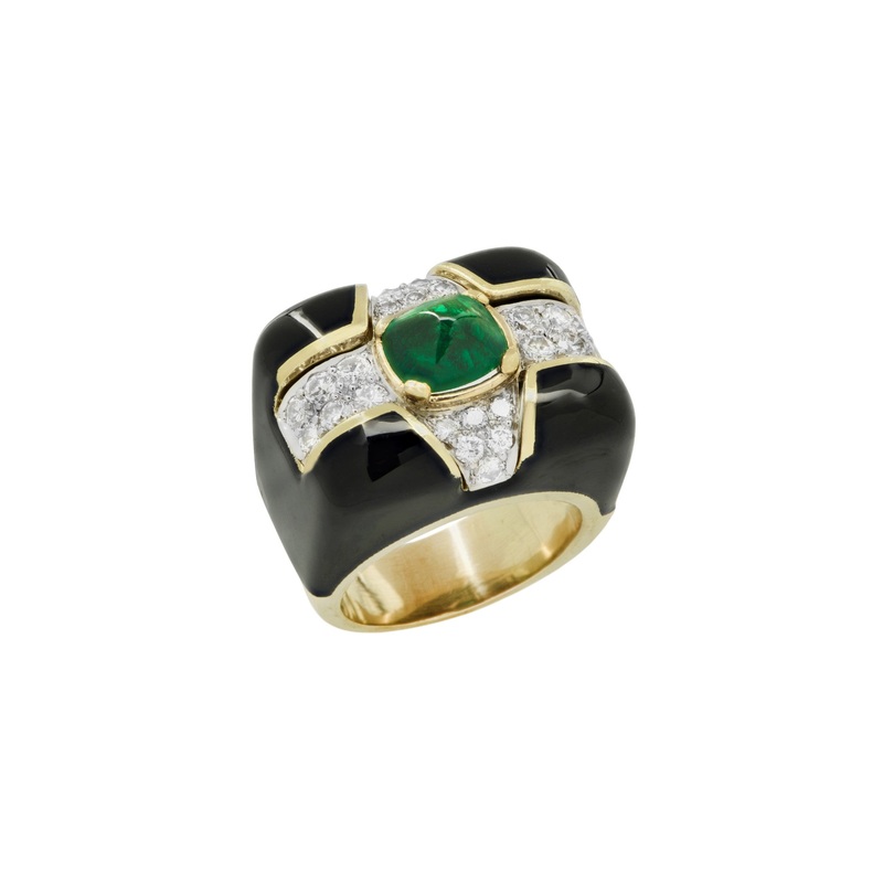 Be the first to review “1980s 18KT White & Yellow Gold Emerald, Diamond & Enamel Ring”