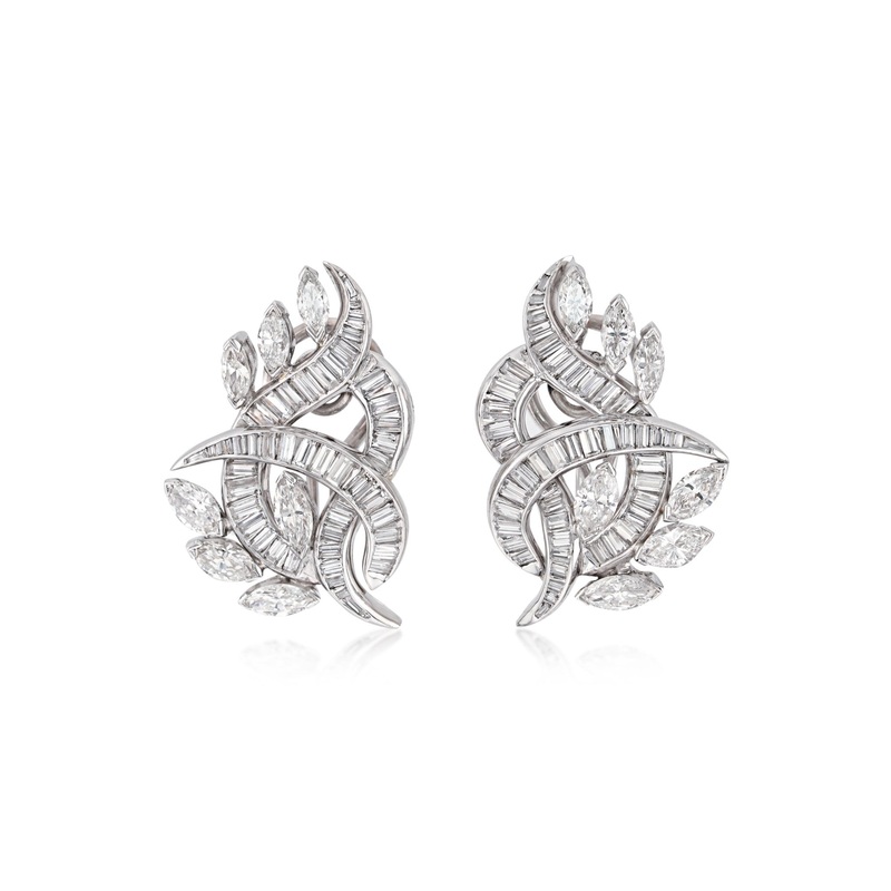 These vintage platinum diamond clip-on earrings feature 144 stones with an approximate total weight of 7.00 carats. Weighing 13.37 grams, the earrings are designed in a style characteristic of the 1980s. The dimensions measure 2.70 by 2.00 centimeters, offering a balanced and elegant appearance suitable for various occasions.