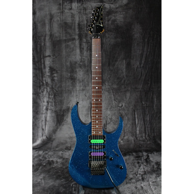 Summary: This 1996 Ibanez RG517, made in Japan, features a basswood body with special blue flaked finish. The neck is one-piece maple with a bubinga skunk stripe with a 24-fret rosewood fingerboard with dot position markers. It has non-original DiMarzio humbucking pickups flanking an Ibanez S1 single-coil controlled by a 5-way selector switch & an Edge double locking tremolo bridge and a locking nut.