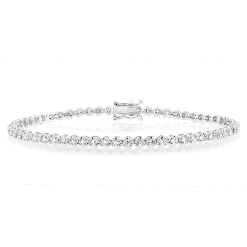 Indulge in pure luxury with our mesmerising 2 Carat Diamond Tennis Bracelet featuring 59 brilliant diamonds set in 9ct White Gold. This exquisite bracelet is a true embodiment of elegance and sophistication. Each of the 59 meticulously selected diamonds shines with breathtaking brilliance, creating a radiant display of sparkle and glamour. The timeless tennis-style design gracefully adorns the wrist, while the lustrous 9ct white gold enhances the beauty of the diamonds, adding a touch of refined opulence. Perfect for special occasions or as a cherished everyday accessory, this diamond tennis bracelet is an exquisite statement piece that exudes timeless beauty and captures the essence of enduring style.