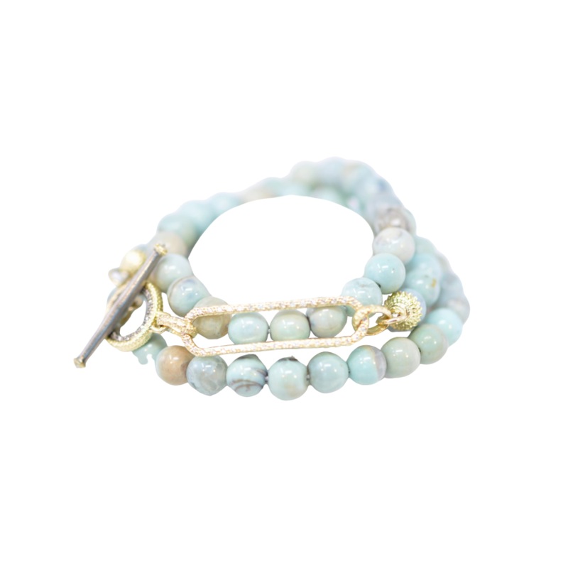 18k yellow gold and blackened sterling silver triple-wrap bracelet w/ Agata Beads 0.04cts White and champagne diamonds. Adjustable at 22.5″