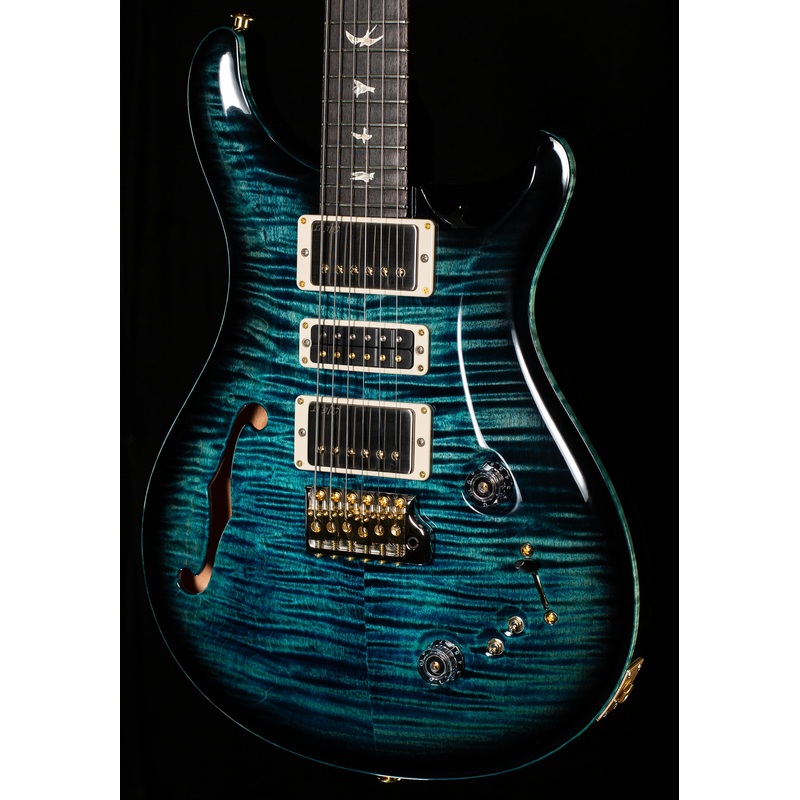 Additional specifications include a maple top, mahogany back, 22-fret 25 scale length mahogany neck, rosewood fretboard, Phase III locking tuners, and the PRS Gen III patented tremolo system. The volume levels between the humbucking and single-coil settings remain very even, and the semi-hollow body with single f-hole provides a welcome airiness and depth to the guitars tone.