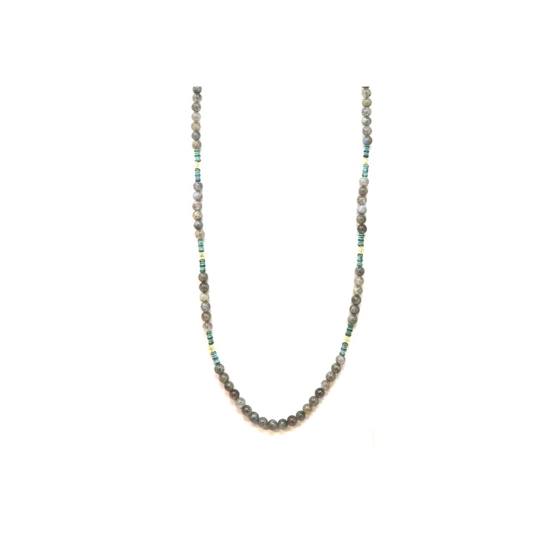 18k Yellow Gold and Grey Sterling Silver Necklace with Labradorite and Artifact Pebbles in Teal Patina. Adjustable At 26″.
