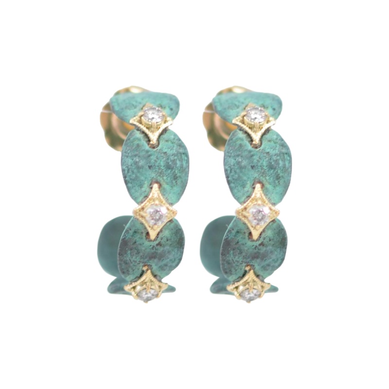 18kt yellow gold 27mm brass artifact side hoop earrings with turquoise patina with crivellis and white diamonds.