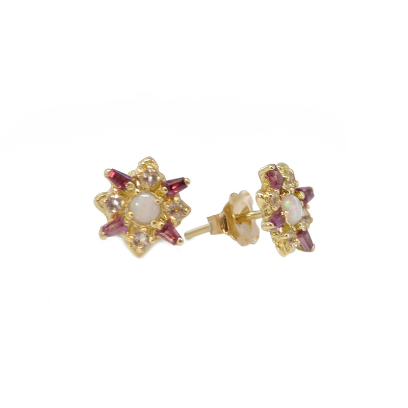 18k Yellow Gold Stud Earringswith AustralianOpal, Peach Morganite, and Tapered Purple Garnets.