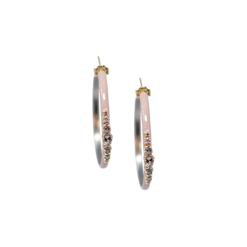 Earring 14k Gold Rose Grey Sterling Silver 35mm Hoop Light Nude Enamel with 0.158 CT Grey Diamonds and spinel.