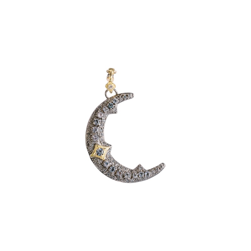Enhancer 18k Yellow Gold and Grey Sterling Silver 35 mm pave Crescent Moon Charm with Crivelli,Lavender Grey Spinel and 0.22 CT White Diamonds.