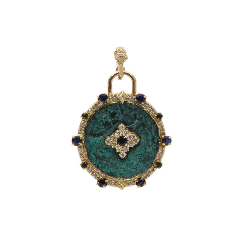 18k Yellow Gold 36 mm round artifact enhancer with diamond pave scroll, blue sapphire, green tourmaline and round white brilliant diamonds with teal patina. Measures 36.61mmx30.95mm (43.34mm with bail)